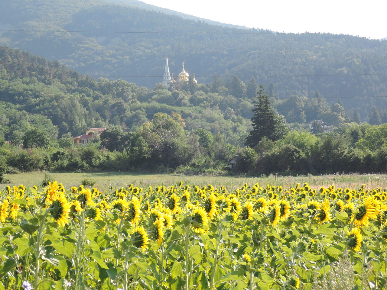 ひまわり畑の向こうに金色の玉ねぎ型の塔が見えます。私達の住む町シプカのシンボルの僧院です。