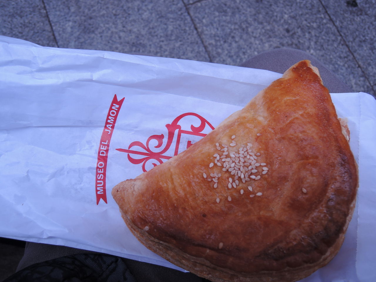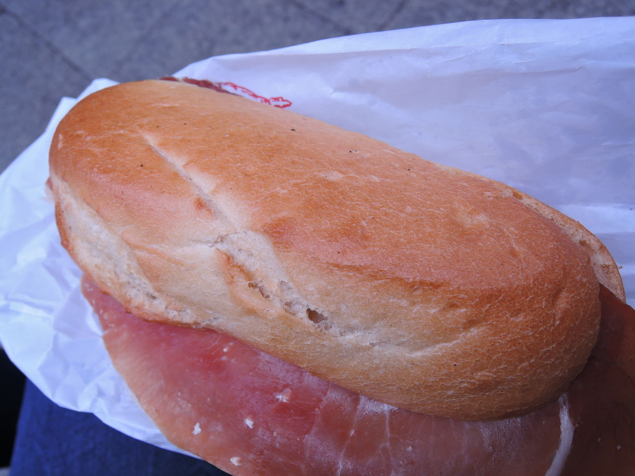 生ハムを挟んだパン 1ユーロ。少し硬めのパンに塩気の効いた生ハムが合って、美味しいです。