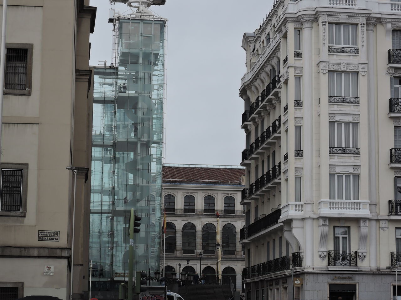 アトーチャ駅正面入口前にあるソフィア王妃芸術センター。外付けのスケルトンのエレベーターがお洒落です。