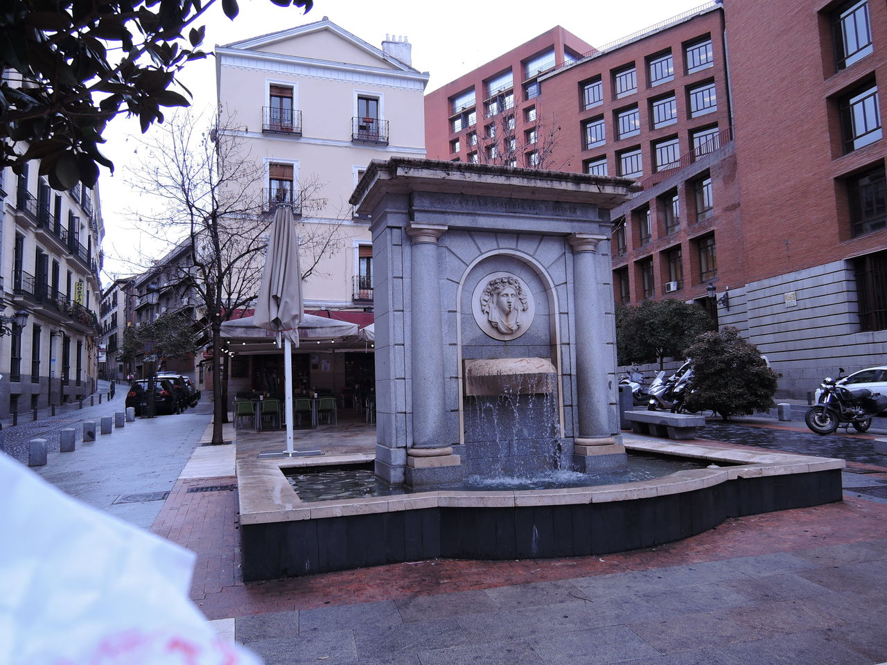 噴水と後ろにはレストランがあります。