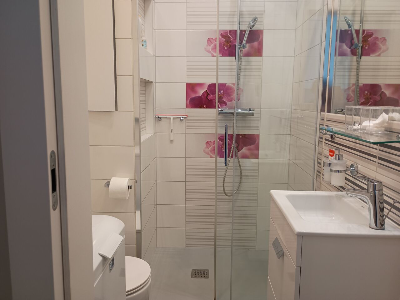 シャワールームの花のタイルがお洒落です